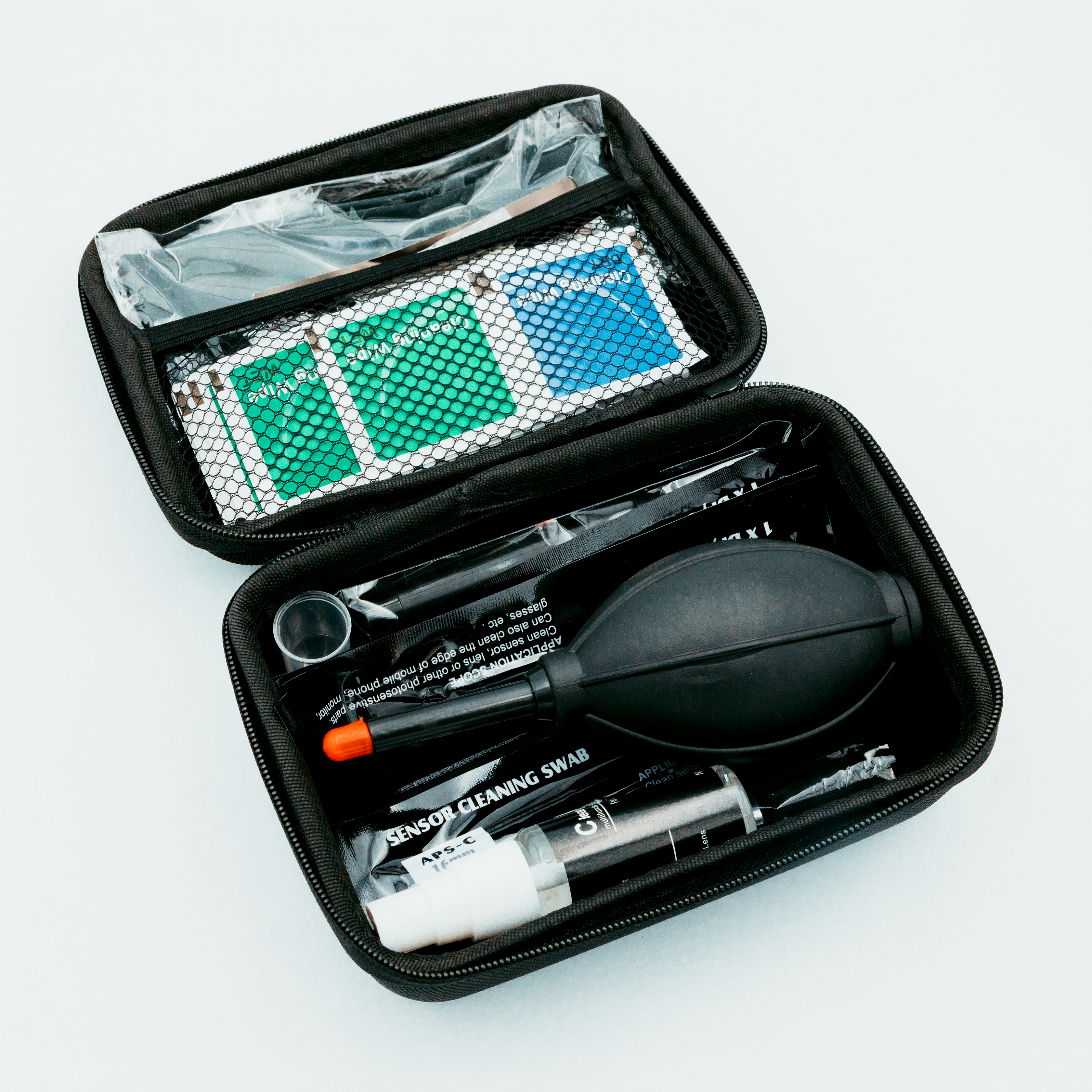 This entire cleaning kit comes in a padded hard case that can easily be packed into your camera bag & case!