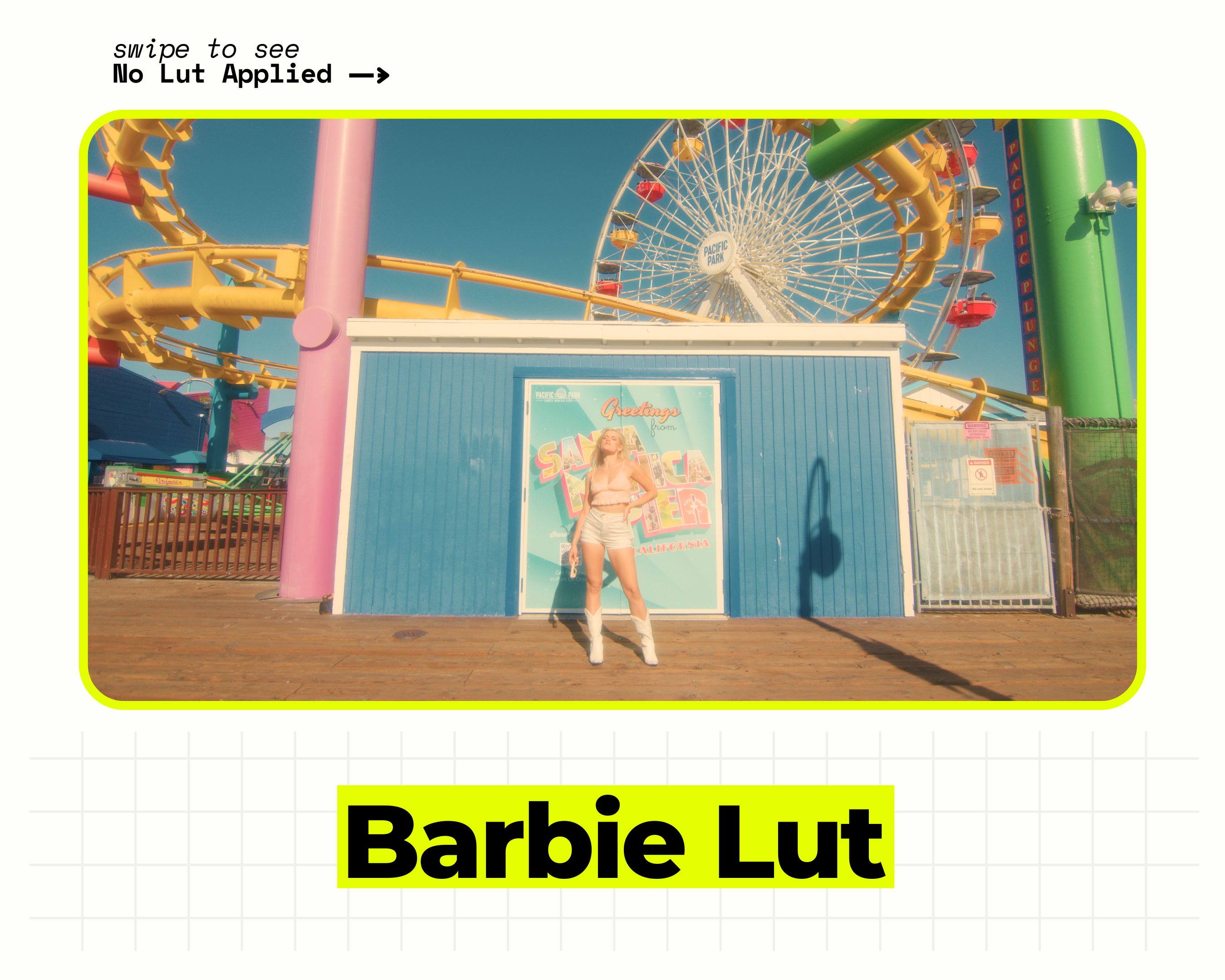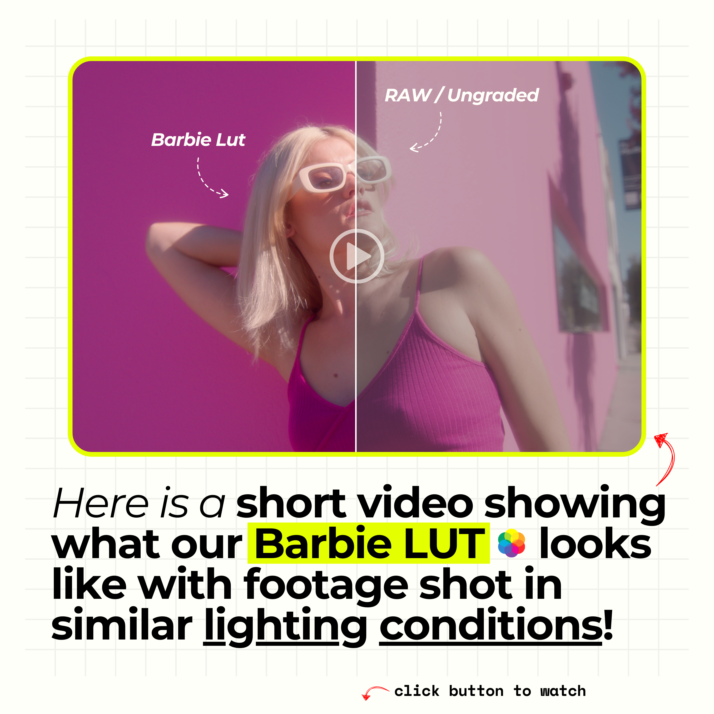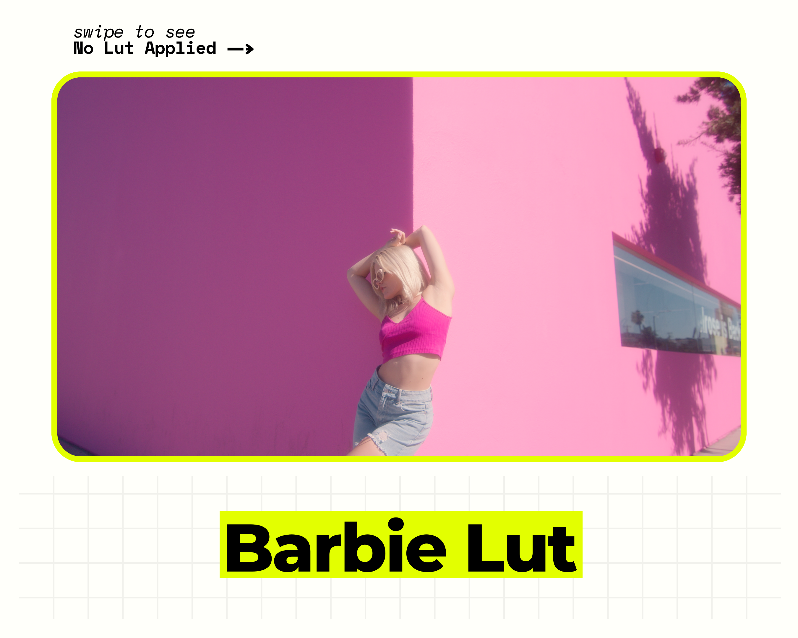 We've included 3 looks that were rebuilt from the colors and tones from the Barbie Movie! We found the best results of the creative LUT are when your footage matches these key reference frames (Sunlit Day / Bright / Soft Key / Strong Backlight / colorful wardrobe & production design)